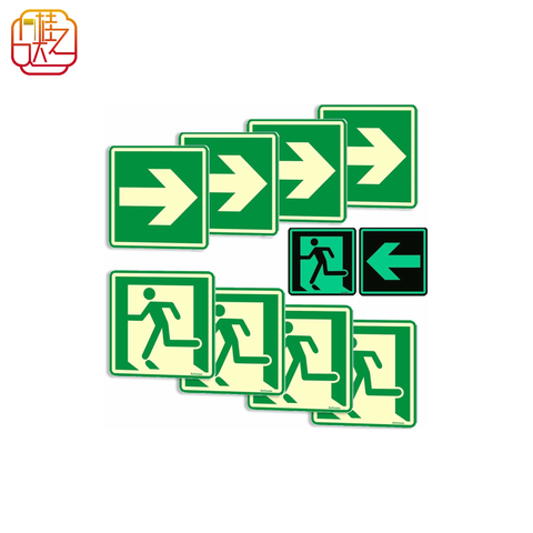 Señal de salida de emergencia que brilla en la oscuridad Calcomanías, (15x15 Cm), Señal de hombre corriendo con pegatinas de luz de flecha direccional